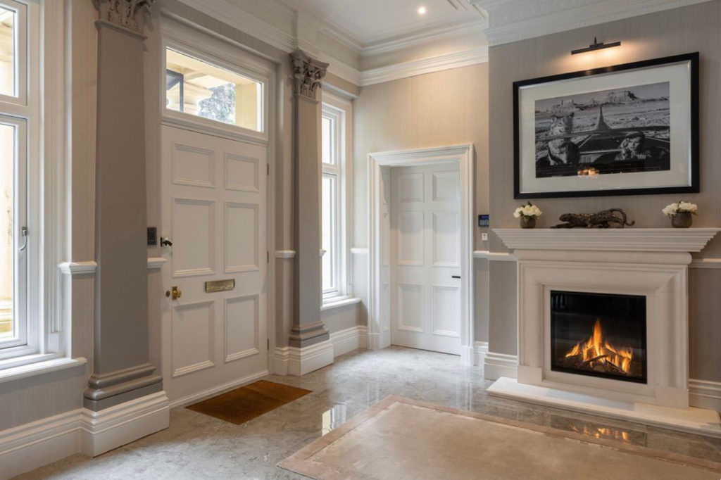 For the entrance, we installed a Barbas Bellfire Topsham Large 3 Gas, complete with a premium burner and black glass interior. This was paired with a fully bespoke limestone surround, crafted to complement the grandeur of the space and create an immediate impression on arrival.